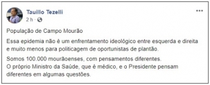 Tauillo Tezelli (Cidadania), prefeito de Campo Mourão, sobre a crise do coronavírus e os pedidos que recebe, alguns pela abertura do comércio, outros para mantê-lo fechado. "Óbvio que também penso na economia, assim como todos"; em artigo publicado nas redes sociais, nesta sexta-feira.