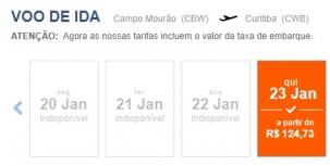 Que tal ir de Campo Mourão a Curitiba, de avião, nesta quinta-feira (7h20), pagando R$ 124,73 pela passagem? Então corra ao site da Gol e feche o negócio. Esse é o preço do dia (pelo menos até as 15h15 desta quarta-feira). Só para se ter uma ideia, no voo seguinte, sábado, a passagem sai por R$ 907,73.