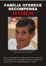 Aparecido Pereira, de 74 anos, chegou à rodoviária de Campo Mourão às 23h30 do dia 21 de dezembro e não foi mais visto. Ele estava vindo de Rondônia para visitar a mãe, em Iretama. A chegada dele na rodoviária foi confirmada por câmeras de segurança. A família pagará recompensa de R$ 5 mil se ele for encontrado. Informações podem ser repassada para a Polícia Militar (190).