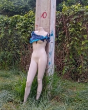 Manequim deixado em poste na rua Mogno, no jardim Flora, em Campo Mourão.