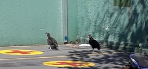 Urubus passeiam por estacionamento comercial no centro de Campo Mourão.