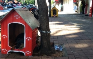 Cachorros de rua ganharam duas casinhas na av. Capitão Índio Bandeira, bem no centrão de Campo Mourão. Repare a corrente e o cadeado que prendem os abrigos nas árvores. Se não fosse isso, levavam as casinhas com cachorro dentro e tudo...