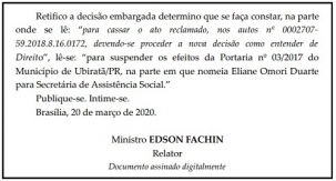 O STF mandou afastar Eliane Duarte do cargo de secretária de Assistência Social de Ubiratã.