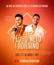 A dupla Pedro Neto & Adriano fará live na próxima sexta-feira (19h) em prol de asilos de 11 cidades. Oito deles na região de Campo Mourão. O projeto visa arrecadar recursos, que poderão ser doados em qualquer quantia, bem como alimentos e produtos de higiene, como fraldas geriátricas. A "live do bem" foi uma iniciativa do deputado Douglas Fabrício. Onde assistir? Youtube.com/pedronetoeadriano