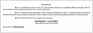 O prefeito Tauillo Tezelli decretou recesso na prefeitura de Campo Mourao próxima sexta-feira.