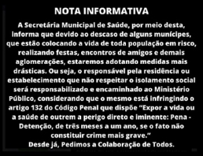 A prefeitura de Nova Cantu informou nesta quinta-feira que levará ao Ministério Público os casos de moradores que não respeitam as medidas de enfrentamento ao coronavírus. A nota fala em medidas mais drásticas devido ao "descaso de alguns munícipes".