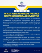 A Acicam pediu nesta quarta-feira que empresários mantenham as medidas preventivas contra a covid-19.