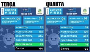 O boletim do Covid-19 desta quarta-feira apresentou dois novos casos confirmados em Campo Mourão. Agora são 33. Os casos suspeitos também subiram de 12 para 18 e os monitorados de 116 e 129. Os internados na enfermaria (4) e na UTI (5) não mudaram, assim como o número de mortes (4). De bom no dia foi mais um paciente recuperado, elevando para 16.