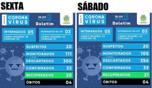 Sábado bom no boletim do Covid-19 de Campo Mourão. Só os números bons aumentaram, a começar pelos recuperados, de 20 para 21. O que é ruim ficou na mesma: confirmados (33), suspeitos (20), internados ns UTI (3), internados na enfermaria (5) e mortes (4). Os monitorados dimimuíram de 111 para 105.