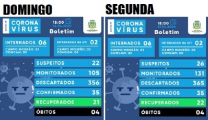 Segunda-feira sem novas confirmações de Covid-19 em Campo Mourão. É o que diz o boletim divulgado pela prefeitura. As confirmações seguem 35. Também não teve mais ninguém internado, nem na enfermaria, nem na UTI. A boa notícia é que mais um se recuperou. Eram 21, agora são 22 . A má notícía é que os casos suspeitos subiram de 22 para 26.