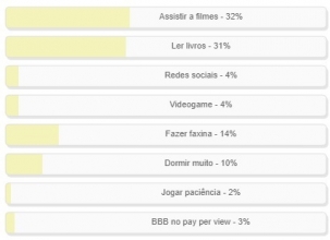Em tempos de quarentena o melhor a fazer é... assistir filmes! Pelo menos foi essa a alternativa que venceu a enquete de Boca Santa, encerrada neste domingo. Teve 32% dos votos. Se bem que foi apertadinho. "Ler livros" fechou com 31%. "Fazer faxina" (14%) e "dormir muito" (10%) vieram em seguida. O resultado completo está no quadro acima. Agora, cá pra nós: Só 3% foram o pay per view do BBB20?...