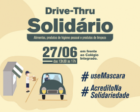O Grupo Integrado realiza neste sábado, das 13h30 às 17h, o Drive-Thru Solidário. A ideia é que a população faça o bem sem sair do carro e sem colocar a saúde em risco. Poderão ser doados alimentos, produtos de higiene pessoal e de limpeza. Tudo em frente ao colégio, na av. Irmãos Pereira, 670. A arrecadação será destianda à Apae, Igreja Católica e Igreja Presbiteriana, de Campo Mourão.