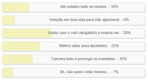 Para 22% é melhor adiar para dezembro e para 18% a eleição deve ser cancelada e os mandatos prorrogados.