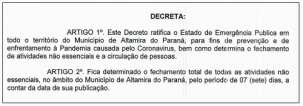 O comércio não essencial de Altamira do Paraná terá de ficar fechado pelos próximos sete dias.