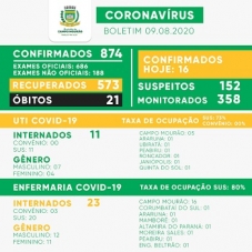 Internações - A ala covid da Santa Casa tem 34 leitos ocupados. Onze deles são na UTI, todos pelos SUS (73%). Na enfermaria a ocupação foi de 18 para 23 leitos (80%). Cinco mourãoenses estão na UTI e 16 na enfermaria.