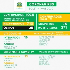 Mais 31 casos de covid-19 foram confirmados nesta quarta-feira em Campo Mourão. O total foi a 1.035. Houve 10 recuperados e agora eles são 710. Como 25 morreram, chega-se ao número de 300 moradores com o vírus ativo no momento, um recorde. A média de novos casos nos últimos sete dias é de 13,5.