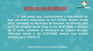 Campo Mourão confirmou mais uma morte por covid nesta quarta-feira. Foi um homem de 43 anos, o 14° óbito da cidade. Morreu também moradora de Janiópolis, de 68 anos, a quarta morte do município. Na região toda já são 49 óbitos por coronavírus desde o início da pandemia.
