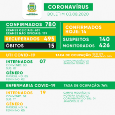 O primeiro dia útil de agosto teve 14 casos confirmados de covid-19 em Campo Mourão. Praticamente o mesmo número da média diária de julho (14,6). O total foi a 780. Houve mais oito recuperados e eles agora são 495. Quinze já morreram. Portanto, são 270 mourãoenses com o vírus no momento.