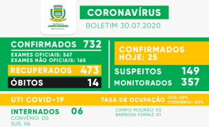Campo Mourão teve 25 casos de covid-19 confirmados nesta quinta-feira. O total desde o inicio da pandemia foi a 732. Houve mais 10 recuperados e eles agora são 473. O número de casos suspeitos caiu de 165 para 149.