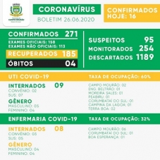 Campo Mourão confirmou mais 16 casos de coronavírus nesta sexta-feira. Todos em exames oficiais. O total foi a 271 (158 oficiais, 113 não-oficiais). O número de recuperados não mudou (185). Os casos suspeitos diminuíram bem, de 131 para 95.