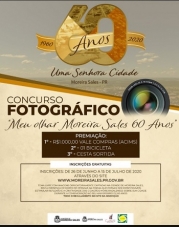 A prefeitura de Moreira Sales abriu inscrições para o concurso de fotos em comemração aos 60 anos do município. O aniversário será dia 25 julho e as fotografias podem ser enviadas até o dia 15. Uma comissão vai selecionas 10 fotos, que passarão por votação popular. Haverá prêmio para as três mais votadas, através de parceria com a Acims. O primeiro lugar levará R$ 1 mil em vale-compras.