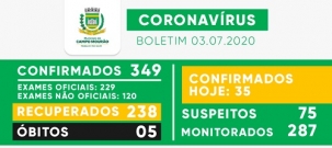 Novo recorde: 35 casos de coronavírus foram confirmados nesta sexta-feira em Campo Mourão. Com isso, o total saltou para 349 desde o início da pandemia. O número de casos recuperados - 28 - também foi recorde para um dia, totalizando 238. O número de suspeitos caiu de 79 para 75.