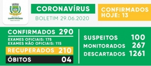 Mais 13 casos de covid foram confirmados nesta segunda-feira em Campo Mourão. Com isso, o total foi a 290, entre exames oficiais e não-oficiais. Houve três recuperados e esse número foi a 210. Já o número de casos suspeitos caiu de 130 para 100. Ao todo, 282 pessoas estão sendo monitoradas no município.