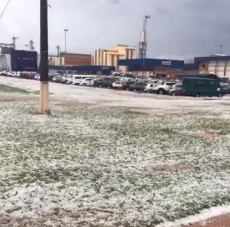 Não é neve. Nem calcário. Granizo na tarde desta terça-feira deixou branco o que era verde, o gramado do Parque Industrial da Coamo, em Campo Mourão.