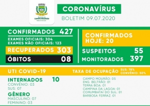 Mais 20 casos de coronavírus foram confirmados nesta quinta-feira em Campo Mourão. O total foi a 427. Houve mais três recuperados e agora eles são 303. Já o número de suspeitos caiu bastante em relação ao dia anterior, de 102 para 55.