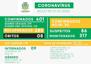 Mais 30 casos de coronavírus foram confirmados nesta terça-feira em Campo Mourão. Com isso o total foi a 401 desde o início da pandemia. Houve mais 15 recuperados, chegando a 285. Já o número de suspeitos aumentou de 72 para 86.