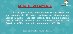 A Santa Casa de Campo Mourão confirmou nesta sexta-feira a morte de homem de 75 anos que estava com covid-19. Ele era interno do Lar dos Velhinhos e tinha sido internado no dia 12. Este é o nono óbito por coronavírus em Campo Mourão e o 38° da região.