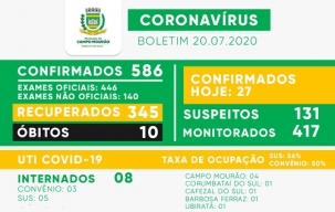 Mais 27 casos de coronavírus foram confirmados nesta segunda-feira em Campo Mourão. O total foi a 586. Não houve recuperados nem mortes. Os casos suspeitos caíram de 189 para 131.