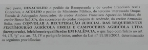 "E a inviabilidade econômica da Recuperada, o não cumprimento do Plano aprovado em Assembleila e a não apresentação de novo Plano no prazo acordado, o descumprimento de decisão judicial, são fatos que levam ao entendimento de não mais existir condições de se manter a situação no estado em que se encontra".