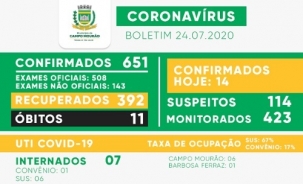 Campo Mourão confirmou mais 14 casos de coronavírus nesta sexta-feira e o total desde o início da pandemia foi a 651. Os recuperados do dia foram mais - 22 -, elevando o total para 392. O número de suspeitos caiu de 115 para 114.