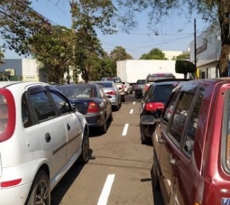 Caminhão "segurando" o trânsito para entrar em uma loja às 10h da manhã em plena av. Irmãos Pereira, em Campo Mourão.