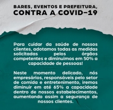 Bares e empresas de eventos de Campo Mourão decidiram, por conta própria, reduzir mais a presença de público. A partir de agora a capacidade será reduzida em 65%. Pelo decreto da prefeitura, bastaria 50%. "A vida não pode parar, mas temos que ser responsáveis dentro desta realidade que todos nós nos encontramos", destaca texto postado em redes sociais.