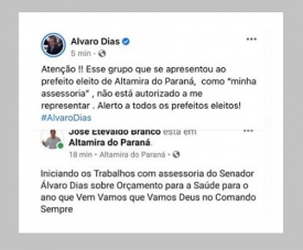 Álvaro Dias, senador, na postagem em que esclarece o caso.