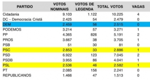 De fora - Dr Marllão, o terceiro mais votado (1.063 votos), não se elegeu porque o partido dele, o DEM, somou apenas 2.515 votos. Precisava de 68 a mais para superar o PSL (2.582) e ficar com a vaga que foi para Paulo Pilatte, eleito com 519 votos.