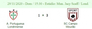 O Sport venceu neste domingo a Portuguesa, em Londrina, por 3 a 1. Foi a primeira vitória na Terceirona deste ano. O time foi a 5 pontos e assumiu a segunda posição no grupo, contra 4 da Lusinha e 1 do Cambé. O Paranavaí lidera com 12. Próximo jogo quarta-feira (15h30) contra Cambé. O mando é o Sport, mas a partida será em Rolândia.