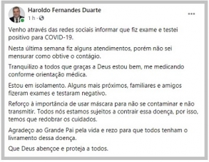 "Tranquilizo a todos que graças a Deus estou bem, me medicando conforme orientação médica", destacou.