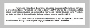 O Ministério Público deu parecer favorável ao registro da candidatura a prefeito de Campo Mourão de Rodrigo Salvadori (PP).