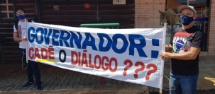 O governador Ratinho Jr estava presente e foi recebido com faixas questionando a falta de diálogo.