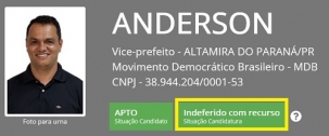 Em Altamira do Paraná, os dois candidatos a prefeito tiveram registros da candidatura deferidos pela Justiça Eleitoral, mas um dos candidatos a vice-prefeito está na situação de "indeferido com recurso". Anderson de Souza (MDB), que faz dobrada com Tassinho (DEM), ainda aguarda julgamento de recurso. O outro prefeitável é Branco (PT), com José Carlos de Souza (PL) de vice.