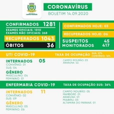 O boletim traz três novos casos de covid nesta segunda-feira, com total de 1.281. Houve seis recuperados e o total foi a 1.043. Os mourãoenses com o vírus ativo são 202.