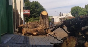 Rua Guarapuava, centro de Campo Mourão. As árvores foram cortadas, mas os troncos ficaram sobre o passeio público.