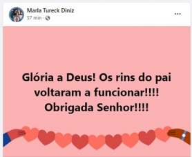 Os rins do ex-prefeito de Campo Mourão, Nelson Tureck, voltaram a funcionar nesta sexta-feira. A informação foi comemorada em rede social por uma das filhas, a ex-deputada Marla Tureck. "Glória a Deus", escreveu ela.