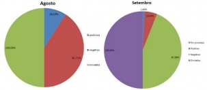 A prefeitura mostrou nesta quarta-feira, em gráficos, a desaceleração do coronavíus em Campo Mourão. Em agosto, foram 1.356 exames em laboratório oficial, com 248 positivos (18,29%). Em setembro, não só o número de exames caiu (815), como o percentual de positivados, que ficou em 10,43% (85).