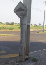 Placa encostada no poste na av. Pedro Viriato, em Campo Mourão.