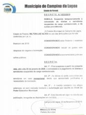 O prefeito de Campina da Lagoa, Milton Luiz Alvez, suspendeu o pagamento de diárias para cargos em comissão.