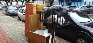 Sofá velho (e outros pedaços de móveis) em calçada da av. Capitão Índio Bandeira, no centro de Campo Mourão.